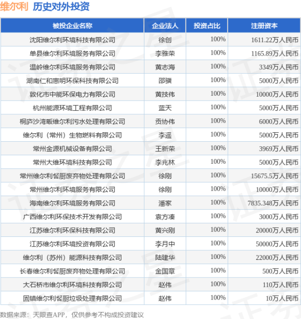 本站讯息,凭证天眼查APP泄漏,维尔利(300190.SZ)新增沿路对外投资事件,被投资公司为沈阳维尔利环境科技有限公司,法定代表东谈主徐创,投资占比为100%。该公司从事生态保护和环境惩办业,注册本钱为1611.22万东谈主民币。当今,维尔利共存在对外投资51项,投资占比前20的形势见下表: 通过天眼查大数据分析,维