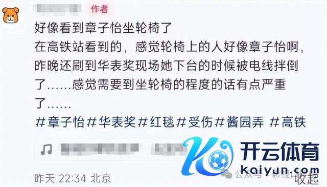 有一位北京的网友,在个东谈主酬酢平台上发文:高铁站看到的,不祥嗅觉轮椅上的东谈主是章子怡啊,昨晚(27)还刷到华表奖现场她下台时被电线绊倒 …。