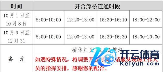 2.东风坝浮桥在试运营时代,逐日开放时候为08:00至20:00。为统筹船舶通航与行东说念主通行需求,浮桥将在此时代分时段连通,具体安排如下: