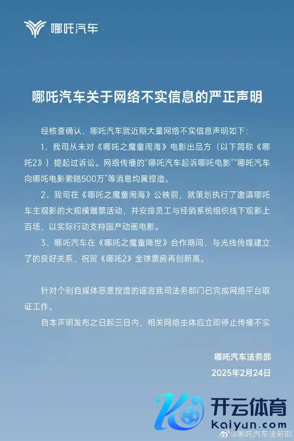 2月24日九游体育app(中国)官方网站,哪吒汽车法务部发布声明称,从未对《哪吒之魔童闹海》电影出品方拿起过诉讼。鸠集传播的“哪吒汽车告状哪吒电影”“哪吒汽车向哪吒电影索赔500万”等音书均属持造。