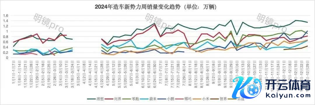要是将2024年全年的周销量(前十)数据拉长来看,就可以反馈出新势力品牌们全年销量上故道理的变动趋势。本文滥觞的图片就是明镜pro凭证第三方的公开数据,统计的2024年造车新势力周销量变动情况(注:由于争议较大,3月25日—4月1日、4月2日—4月8日、4月15日—4月21日这三周的数据缺失)。本次统计,仅为跨界造车的新品牌,包含理念念、问界、小鹏、小米、蔚来、哪吒、零跑、高合、合创、极越、创维、爱驰等。并不包括传统车企的新品牌,比如腾势、智己、岚图等品牌。