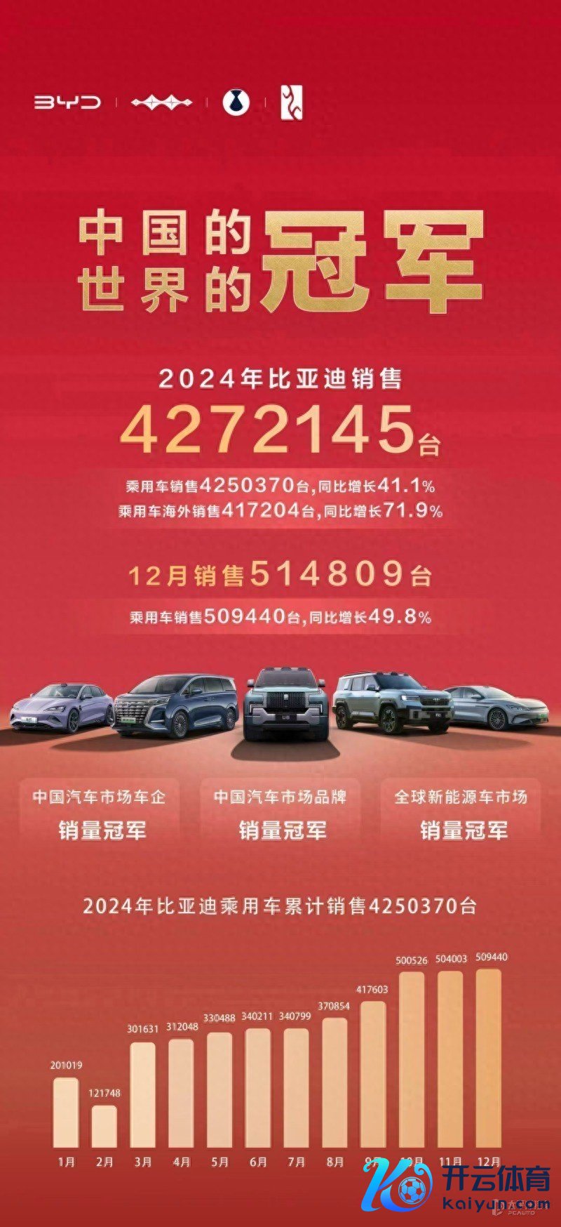 【太平洋汽车 行业频谈】2025年1月1日晚间九游体育娱乐网,比亚迪发布了一则销量数据,惊东谈主的数字再次诠释了其在寰球汽车市辘集的深广实力,蝉联中国汽车市集车企销量冠军、中国汽车市集品牌销量冠军以及寰球新能源车市集销量冠军。