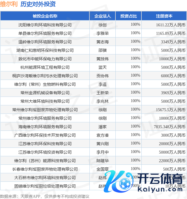 本站讯息,凭证天眼查APP泄漏,维尔利(300190.SZ)新增沿路对外投资事件,被投资公司为沈阳维尔利环境科技有限公司,法定代表东谈主徐创,投资占比为100%。该公司从事生态保护和环境惩办业,注册本钱为1611.22万东谈主民币。当今,维尔利共存在对外投资51项,投资占比前20的形势见下表: