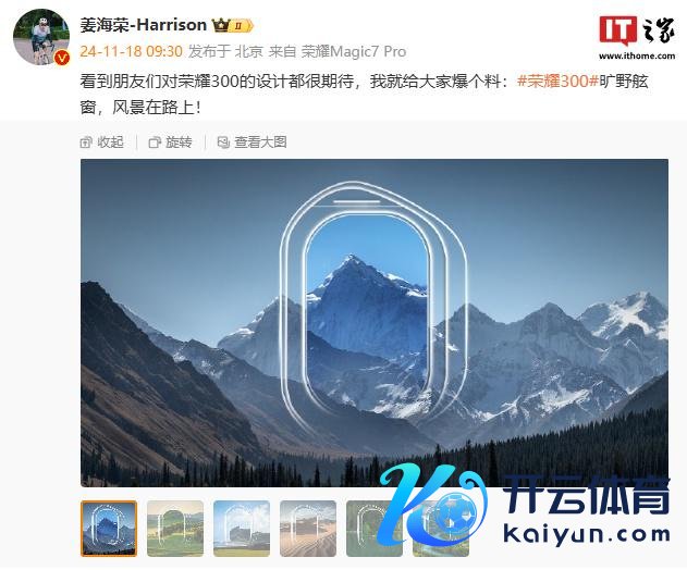 IT之家 11 月 18 日音信九游体育娱乐网,中国区 CMO 姜海荣当天浮现荣耀 300 系列手机将搭载“郊外舷窗”,并放出了一组步舆图走漏新机的缱绻。