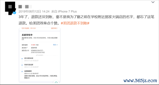 有蓝V认证账号2019年8月12日发布微博示意,“3年了,退款还没到账”,讥笑称“给好意思团效果点个赞”。