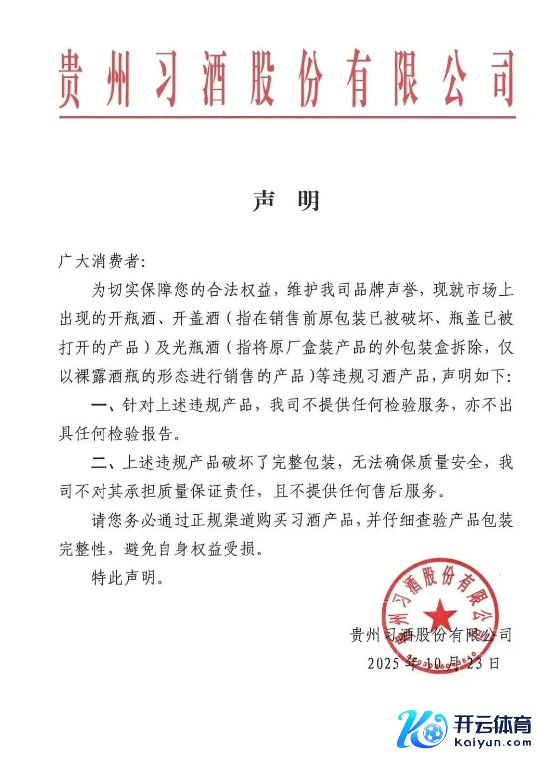 此前,10月17日,习酒发布《致习酒吃亏者的示知书》,就近期在抖音、天猫、拼多多等电商平台出现未经授权的非正规店铺销售习酒居品的悠然,向吃亏者发出风险指示并作出严正声明。