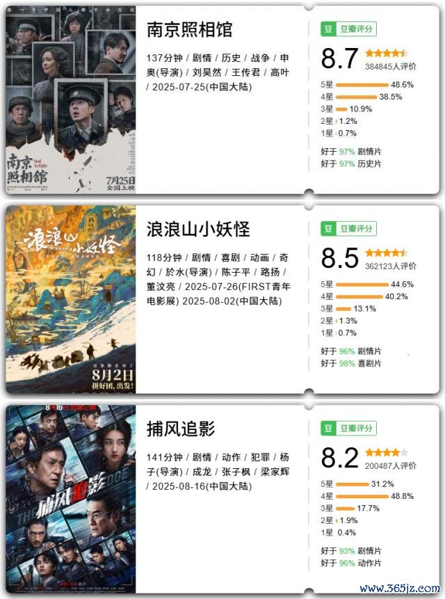 另一方面,对比往年的暑期档,咱们会发现本年暑期档是较为健康、合理的一次。票房榜前三名,豆瓣评分分别达到了 8.7、8.5、8.2。
