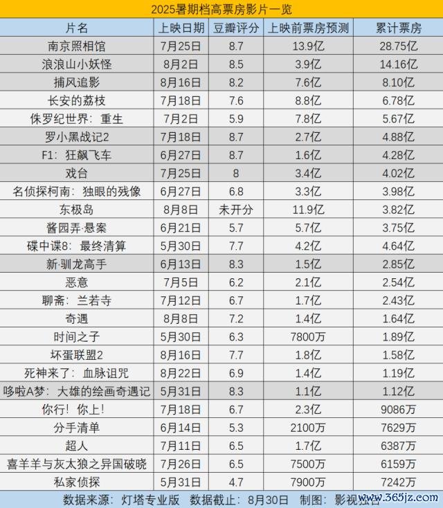 收尾呢,本年暑期档不仅新片供给充足,莫得闹片荒,况且还出现了总票房瞻望能冲突 30 亿的《南京影相馆》、16 亿的《浪浪山小妖魔》。
