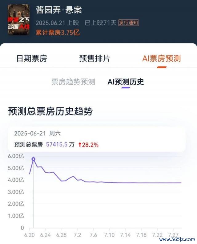 《酱园弄 · 悬案》的映前预测总票房为 5.7 亿,一经算是相当保守了。然而映后豆瓣分幽静到 5.7 后,票房发挥昭着越发乏力,最终只收得 3.75 亿。