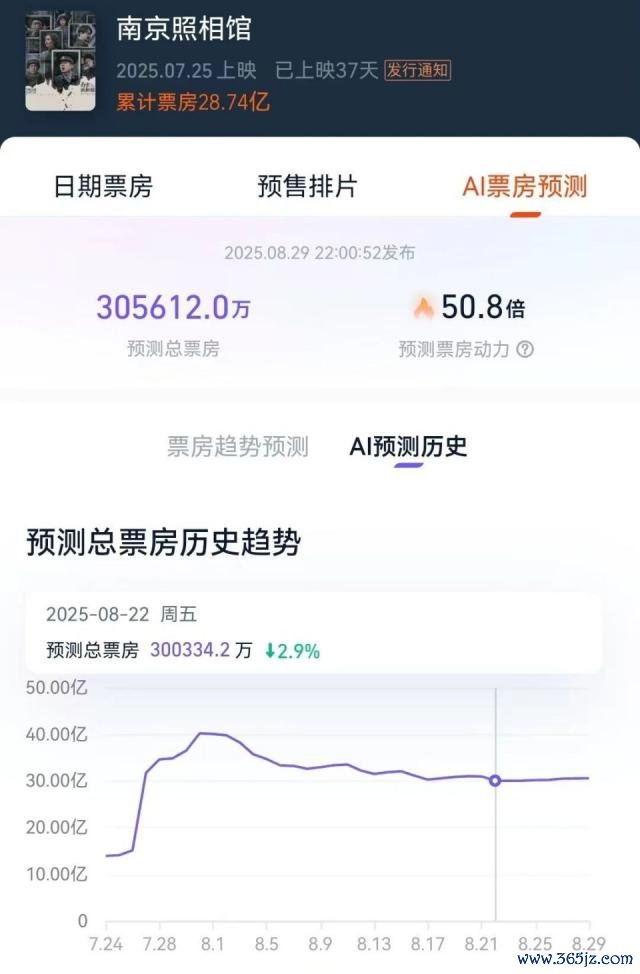 然而《南京影相馆》上映后,乘着豆瓣开分超 8 分的东风,顷刻间火遍寰宇。AI 的预测总票房整夜间从十几亿上调到了三十几亿。