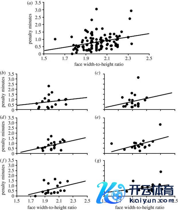 六支加拿大球队的男性行状曲棍球指点员的面部宽高比和膺惩性行径之间的关系:(a)总体分析,b-g单独球队分析,图源:参考文件 [3]