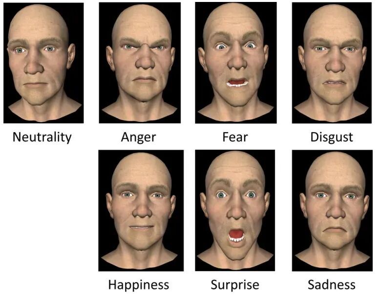 东说念主类是面部异常彰着的生物,面部色调在咱们的交流疏导中传达了许多信息,因此咱们当然不错从丰富的面部色调中寻找到信息,比如下图是中性色协调六种基本情谊的3D模拟,敬佩全球不错当然从其中感受到相应的热诚[6]。