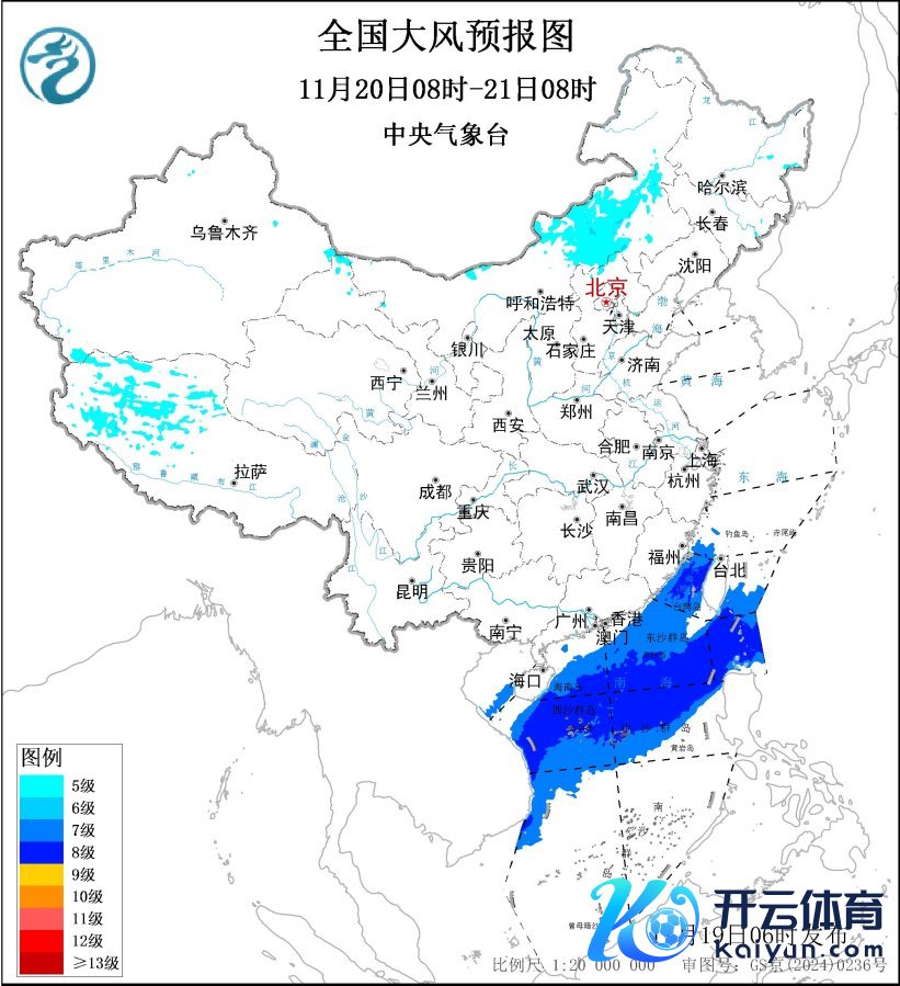 11月20日08时至21日08时九游体育娱乐网,新疆东部、甘肃河西、内蒙古中东部、河北北部、西藏西部等地将有5~6级风,阵风7~8级;台湾海峡、台湾以东瀛面、巴士海峡、南海北部和中部海域将有7~8级、阵风9级的大风。