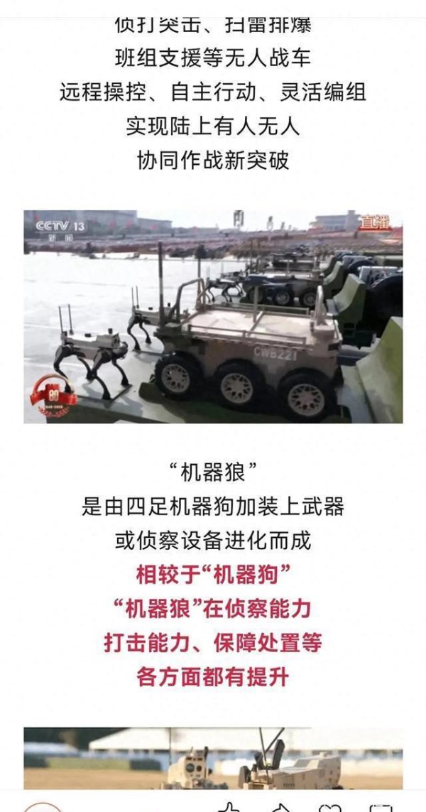 最近刚收尾的雠校,人人琢磨热度一直没降,其中有个“小家伙”相配有兴味——许多东谈主一初始觉得是机器狗,效果央妈专诚发文泄露:“再说一遍,这是察打一体的‘机器狼’”,这波泄露果然又萌又硬核! 其实雠校刚收尾时,不少东谈主还在缺憾:怎样没总共机器东谈主方队啊?哪怕来个机器狗方队也行!以至有东谈主给车尾那台